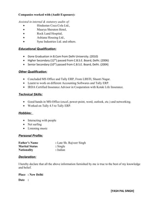 Yash Pal Singh is seeking a leadership role that provides challenges and opportunities for growth. He has over 10 years of experience in accounting and finance roles, including maintaining books of accounts and handling customers efficiently. His experience includes raising and maintaining invoices, tracking payment due dates, monthly closing activities, and handling customers at Star Human Sciences Pvt. Ltd. and accounts assistant duties at Rajesh Suresh Jain & Associates. He has a B.Com graduate degree and skills in MS Office, Tally, and insurance qualifications.