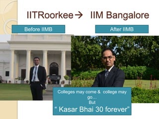 The document discusses Professor Yashad Kasar of I-Top, who studied at IIT Roorkee and IIM Bangalore. It mentions that Kasar is a guitarist and won an award for being Vodafone's best customer for the longest call duration of 7 days, 13 hours, and 29 minutes. It also references an upcoming Anveshan trip and jokes about what really happens on such trips, as well as how Kasar receives fruit baskets every two weeks from his girlfriend and struggles to afford new speakers by exchanging them.