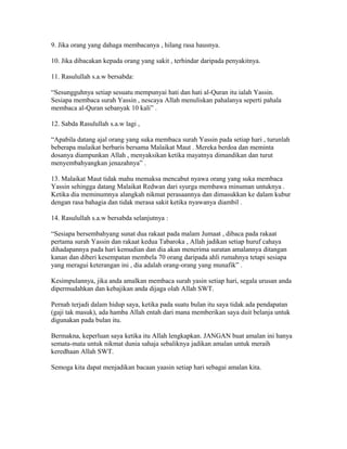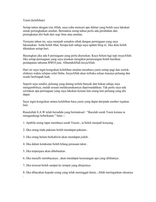 1) Dokumen tersebut membahas kelebihan membaca surah Yasin setiap hari
