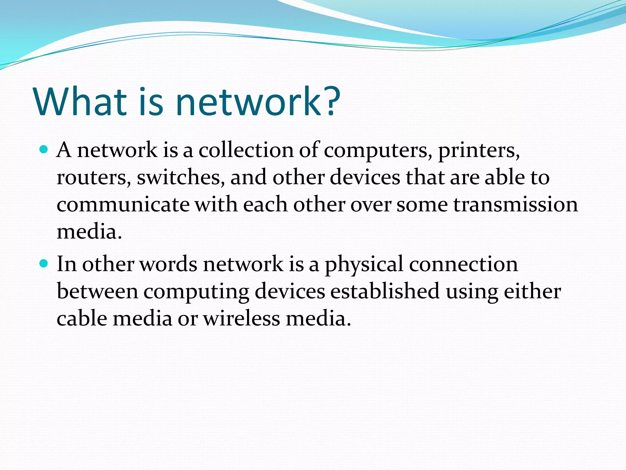 A network connects computing devices like computers, printers, and routers that can communicate with each other. There are several types of networks including local area networks (LANs) that connect devices within a building, metropolitan area networks (MANs) that connect LANs across a city, and wide area networks (WANs) that connect LANs over a larger geographic area. Networks use devices like switches, routers, and bridges to direct data between connected devices and allow communication. Routers in particular send data packets between different networks by maintaining routing tables that contain addressing information.