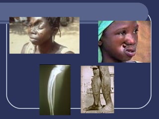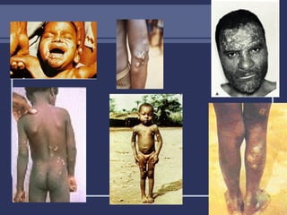 Yaws is a chronic, nonvenereal infection caused by the Treponema pertenue bacteria that is transmitted through direct skin-to-skin contact. It commonly affects children in tropical areas where sanitation is poor. Early symptoms include skin lesions that can cause long-term damage if left untreated. Laboratory tests confirm the presence of the bacteria, while treatment involves antibiotics like penicillin. Prevention relies on improving living conditions and interrupting transmission between individuals.