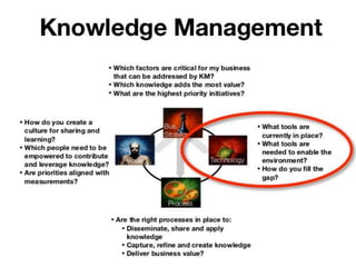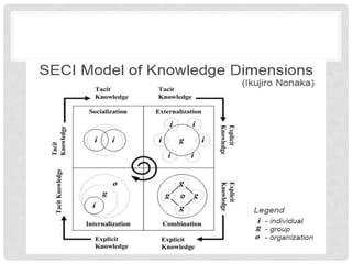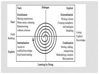 The document discusses knowledge management, highlighting its importance for organizational objectives and decision-making through the effective sharing and utilization of knowledge. It outlines the processes involved in knowledge management, the benefits it provides, and various types of knowledge, emphasizing the need for a culture that fosters knowledge sharing. The text also introduces models for knowledge conversion and decision-making strategies to enhance organizational capability and response to changing demands.