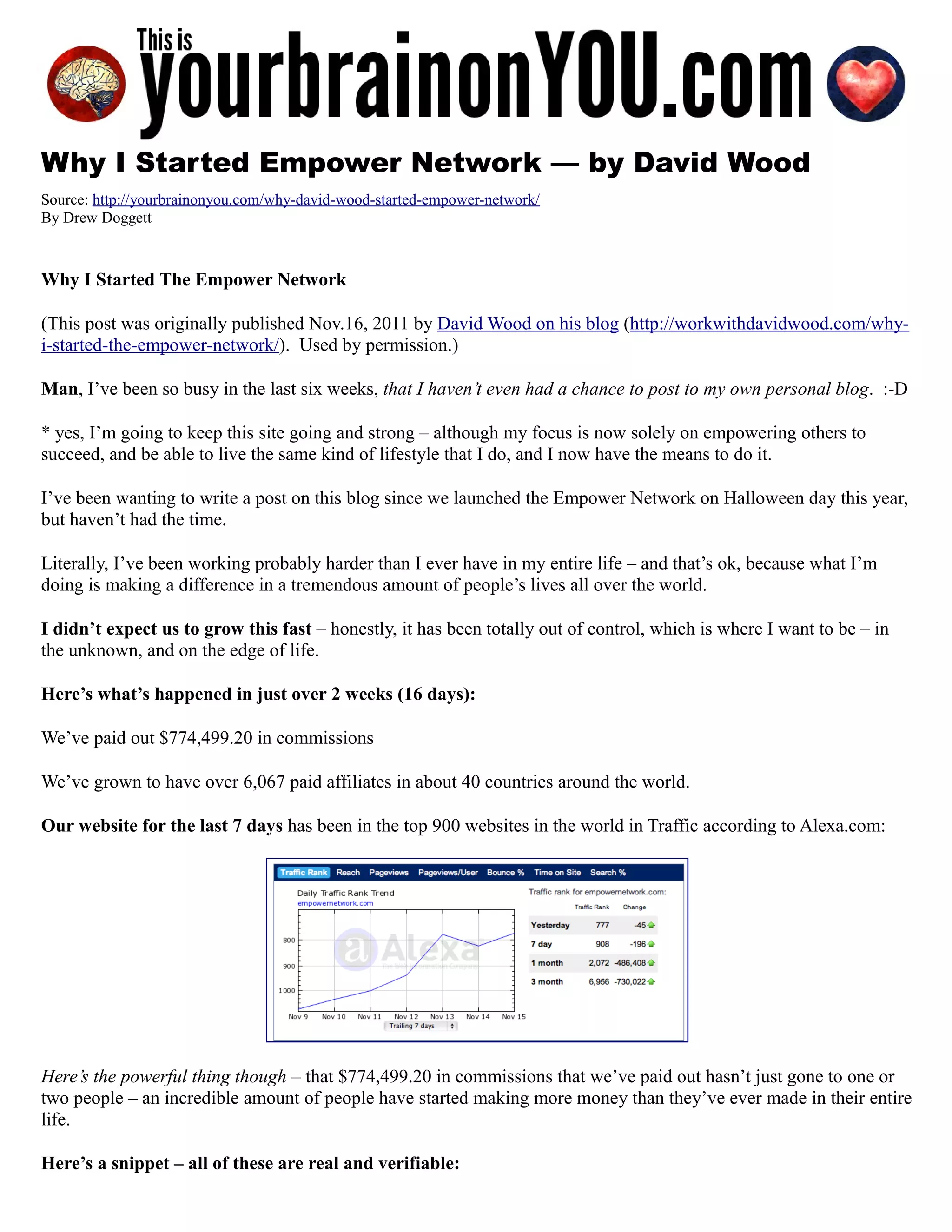 David Wood started the Empower Network to simplify affiliate marketing and make it possible for average people to earn a living part time. In just over two weeks, the Empower Network had grown to over 6,000 members across 40 countries and had paid out $774,499 in commissions. Many members had earned more than they ever had before, including one couple who earned $30,800 as part-time musicians. Wood founded the Empower Network to create a new system that was easy for anyone to use to promote their business and make money, without the complexity of traditional affiliate marketing.