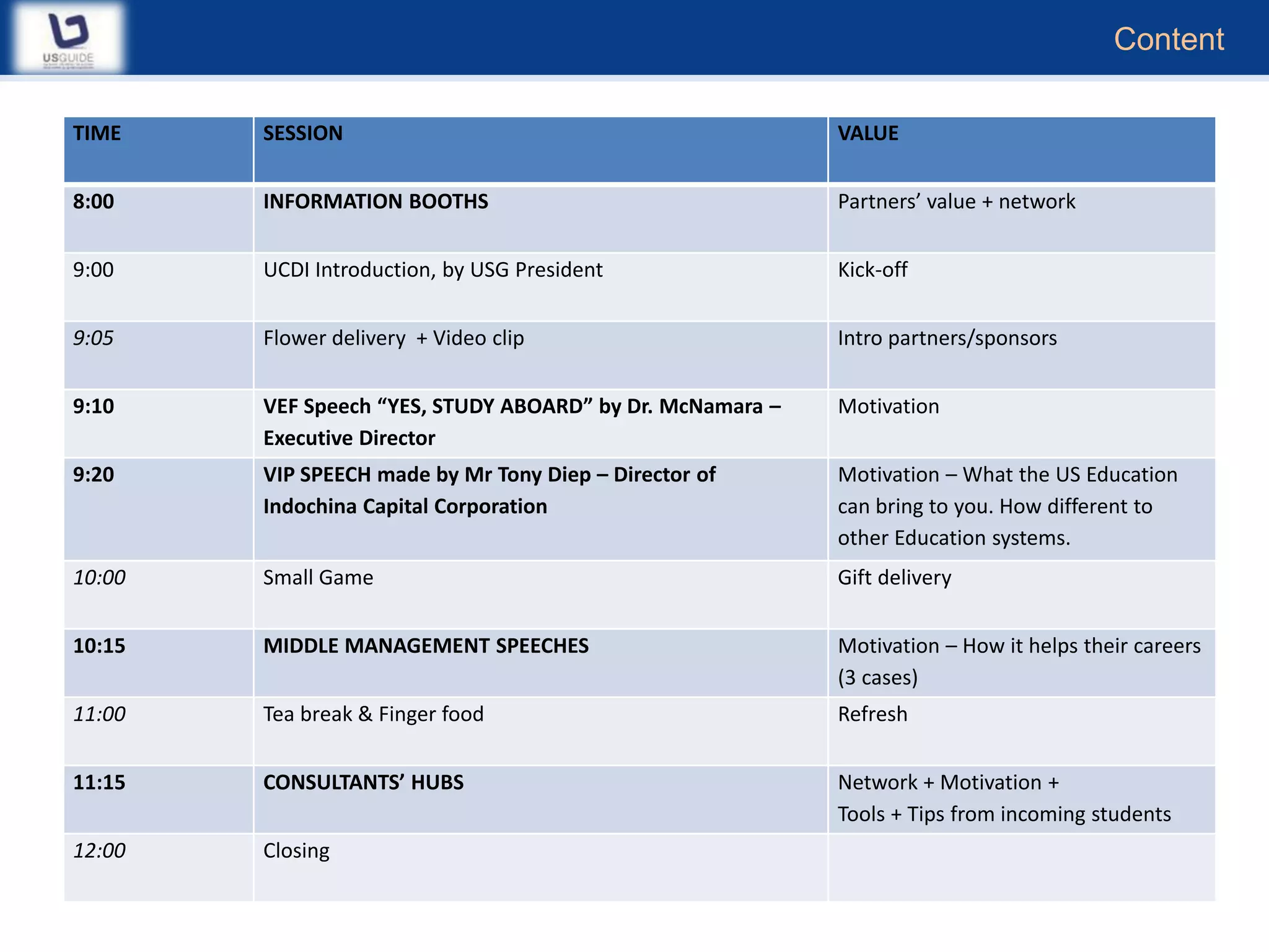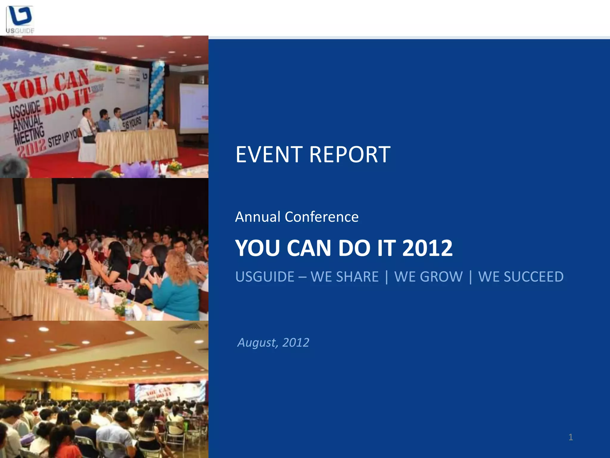 The document provides details of the annual conference "YOU CAN DO IT 2012" organized by USGUIDE. It includes the schedule of sessions on the first day of the conference focusing on motivating students to study abroad in the US through speeches from industry professionals and university representatives. It also lists the speaker profiles and participant analysis results from the conference, showing over 1000 people registered with over 90% gaining confidence in applying to US post-graduate programs after attending.