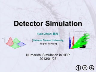 The document provides an overview of detector simulation. It introduces the goals of tracking systems, calorimeters, and muon detectors. It discusses full simulation with GEANT and fast simulation tools like PGS and Delphes. Events are generated, passed through the detector simulation, and then reconstructed. Visualization tools can display tracks and energy deposits. Exercises are provided to give hands-on experience with simulation and analysis concepts.