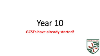 This document provides information about the Year 10 programme and support at Chew Valley School. It includes details about the head of year and tutors, expectations for academic achievement and citizenship, and sources of pupil support. A variety of extracurricular opportunities are described, such as the Duke of Edinburgh award scheme and lunchtime sports training. The calendar lists important dates including assessment weeks and parents' evening. Communication methods like email and Twitter are outlined.