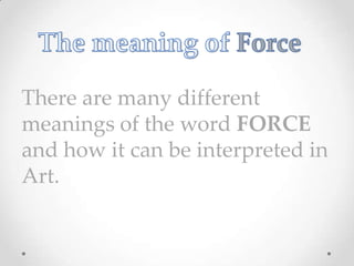 This document provides guidance for a GCSE Art exam focusing on interpreting the theme of "Force" through looking at artists, experimenting with media, developing ideas, and creating a final piece. It outlines the assessment criteria, suggests starting points like people, places, nature, objects, activities, and imagination, and shares examples of artists that could inspire ideas related to these starting points. Students are encouraged to begin working straight away on the exam in order to meet the submission deadlines in early May.