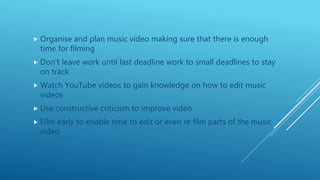 Plan your music video project carefully, leaving enough time for filming and editing. Work towards smaller deadlines to stay on track. Watch tutorial videos to learn video editing skills and use feedback to improve your final product.