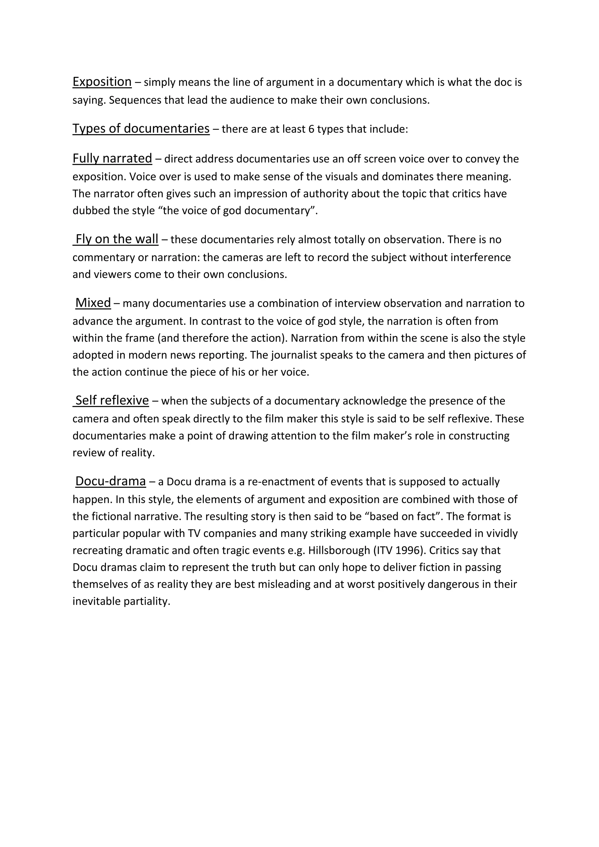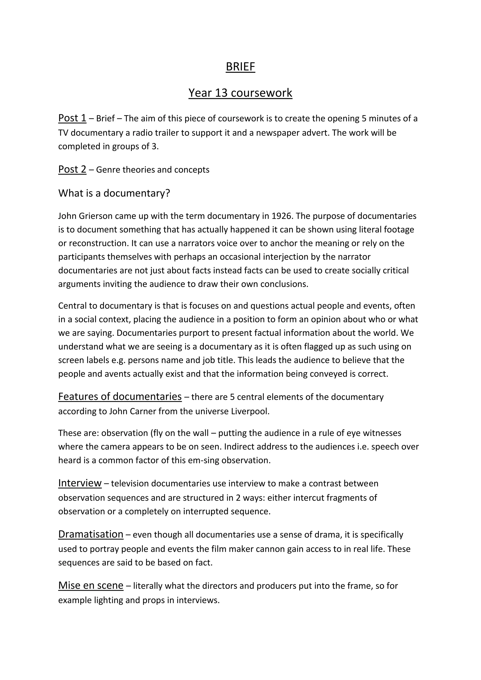 This document provides information about creating a TV documentary, radio trailer, and newspaper advert for a coursework project. It discusses the history and purpose of documentaries, noting they document real events and issues to invite audience analysis. Key documentary elements are identified as observation, interviews, dramatization, mise-en-scene, and exposition. Common documentary types are also outlined, including fully narrated, fly on the wall, mixed, self-reflexive, and docu-drama formats.