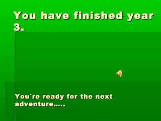 The student has completed their third year of school. They enjoyed a variety of hands-on learning experiences, such as designing moving book parts, acting out an Aztec sacrifice, making parachutes and paper spinners, drawing patterns outside, and science experiments involving electricity. They are now ready for their next educational adventure.