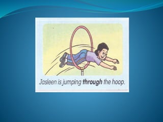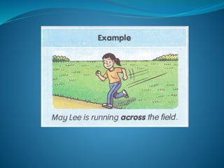 This document contains a series of sentences with blanks to be filled in with either "through" or "across". Each sentence describes an object or person moving from one location to another, with the prepositions "through" and "across" being used to indicate movement. The correct preposition is then revealed for each sentence. The document is testing understanding of when to use "through" versus "across".