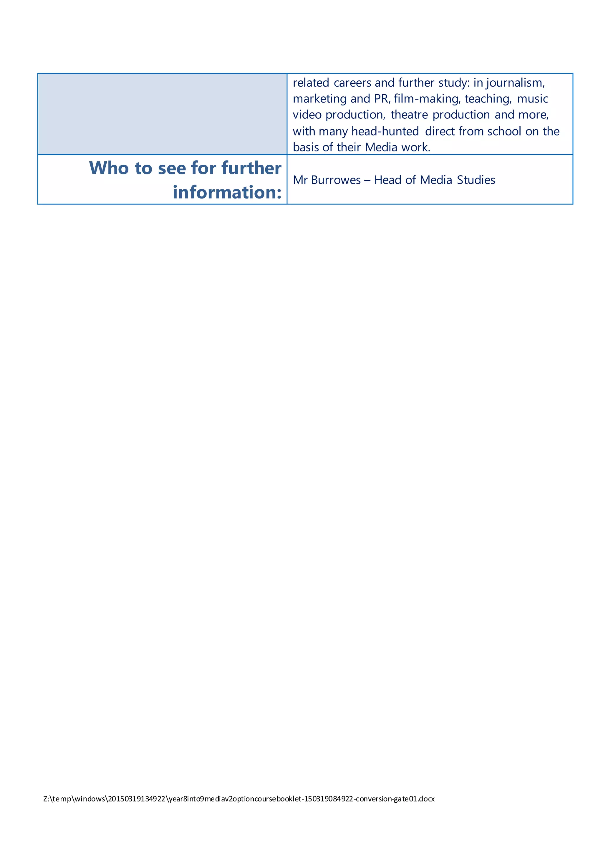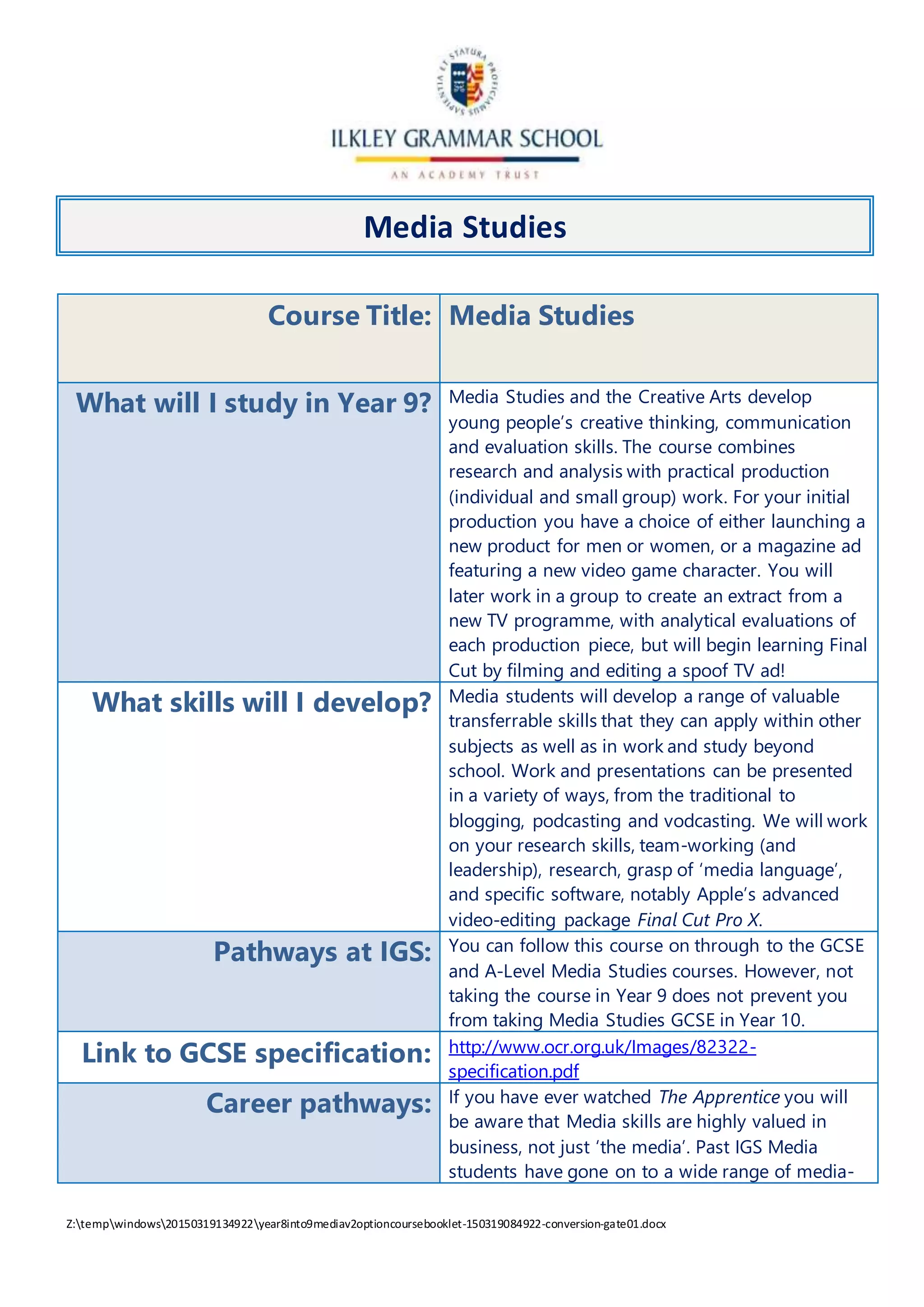 The Media Studies course in Year 9 develops students' creative thinking, communication, and evaluation skills through both research and practical production work. Students will choose an initial individual or group production involving launching a new product or magazine ad. Later, students will work in groups to create an extract from a new TV program and analyze all production pieces. Students will also learn video editing skills by creating a spoof TV ad. The course helps students develop transferable skills like teamwork, leadership, research abilities, and skills with software like Final Cut Pro X. Students can continue Media Studies to GCSE and A-Levels, but the Year 9 course is not required to take the GCSE. Past students have pursued various media-related careers in fields like