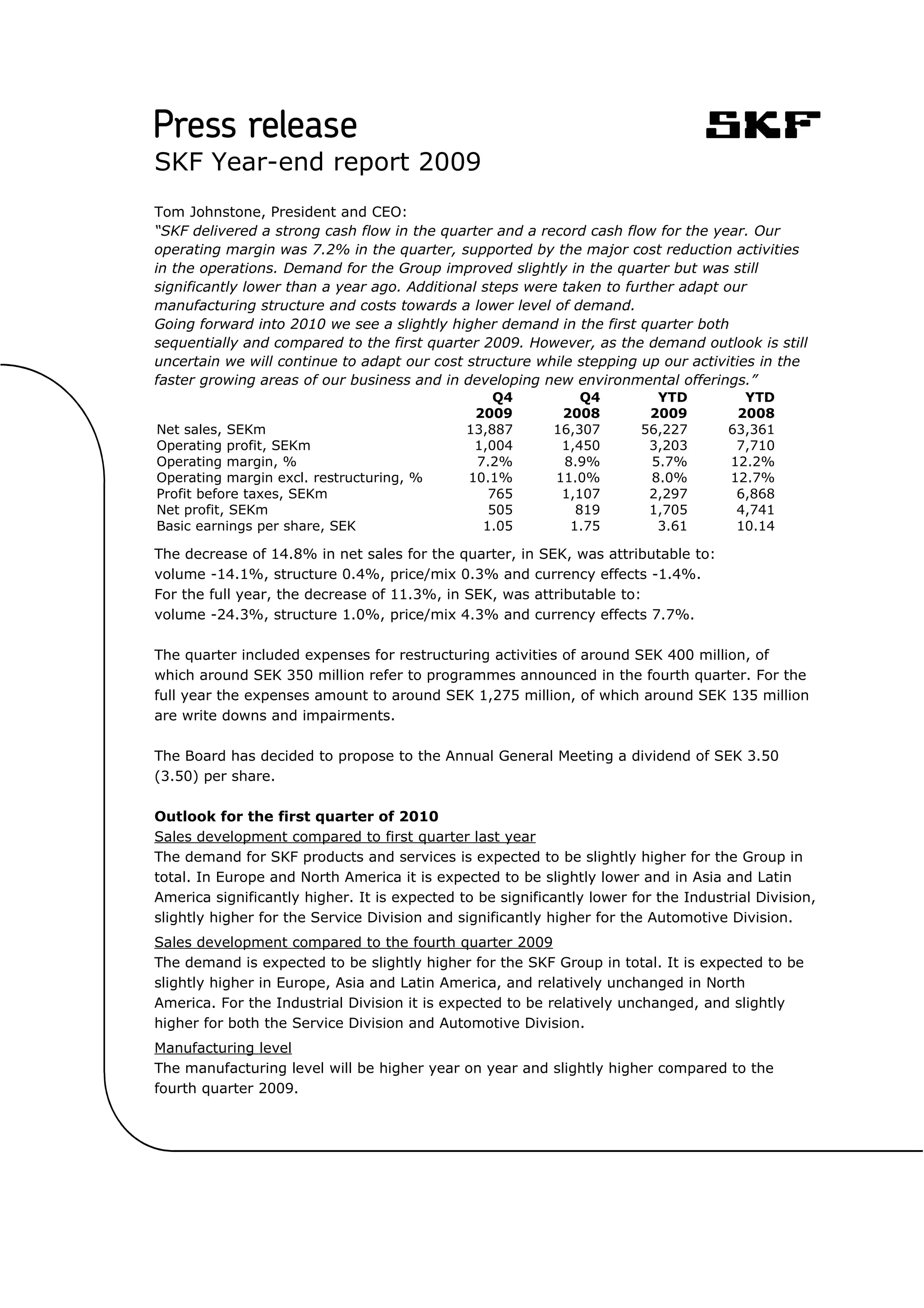 SKF reported financial results for Q4 2009 and full year 2009. While sales and profits declined compared to previous year, cash flow for 2009 was a record high. Demand improved slightly in Q4 but was still lower than a year ago. Additional cost reduction efforts were undertaken. For Q1 2010, demand is expected to be slightly higher than Q4 2009. The company will continue adapting costs while increasing activities in growing areas and new environmental offerings.