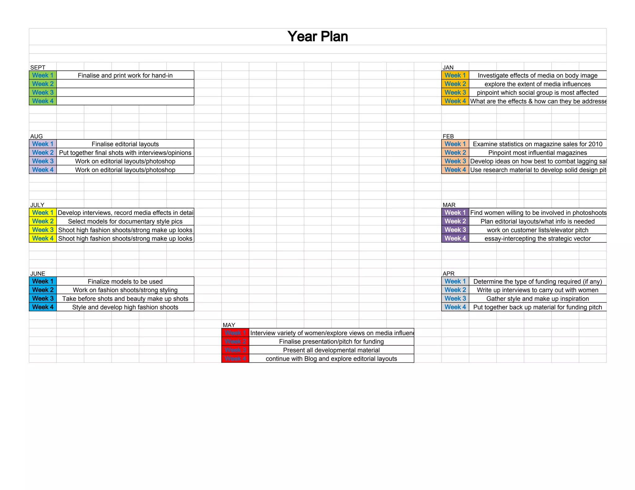 In September, finalize work for a hand-in and investigate the effects of media on body image. In January, examine magazine sales statistics from 2010 and develop ideas to combat lagging sales. Throughout the year, activities include developing interviews, photoshoots, presentations and editorials exploring media influences and women's views.