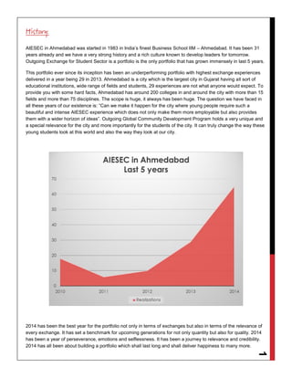 This document summarizes the activities and performance of the Outgoing Global Community Development Program portfolio in AIESEC Ahmedabad for 2014. It highlights that 2014 was the best year for the portfolio to date, with 45 exchanges in the summer cycle and 20 in the winter, surpassing previous years. Key projects focused on building strong leadership, tracking team performance, and creating quality experiences for students. While some university relations and international cooperation efforts fell short, overall 2014 saw many successes, including national contributions and leadership development within the local committee. It concluded that the portfolio's growth was driven by members' determination and choice to act courageously despite challenges.