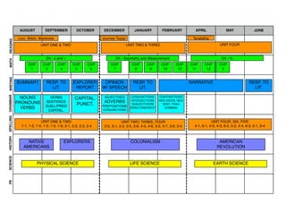 This document outlines a school curriculum plan spanning multiple months. It includes reading assignments, units in math and writing, grammar topics, spelling lists, history lessons, and science units. For example, in August the reading assignment is The Lion, the Witch and the Wardrobe, while math focuses on unit 1 and includes operations with fractions. It also lists chapters in history, science areas covered, and physical education.