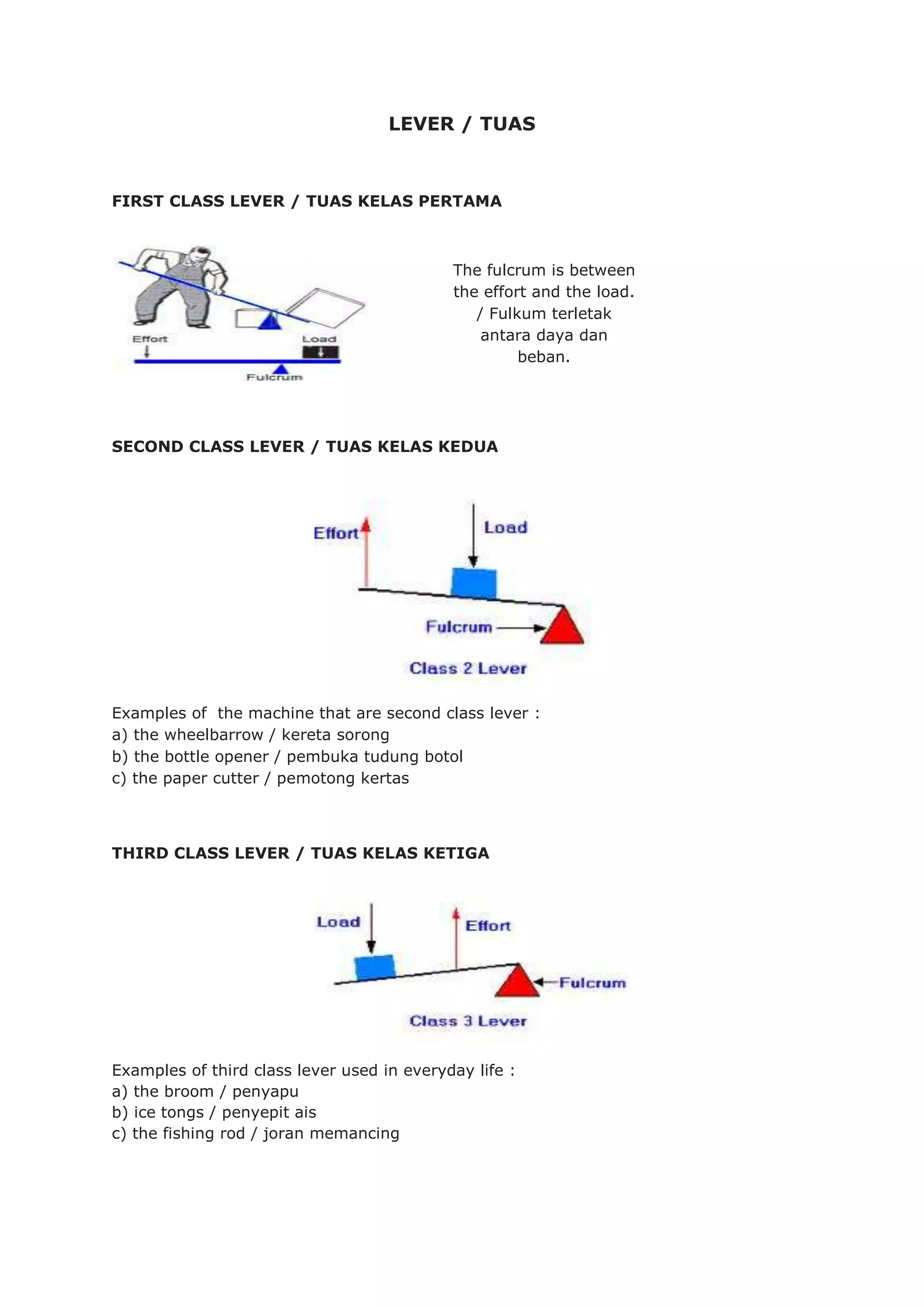 This document discusses the three classes of levers and provides examples of each. A first class lever has the fulcrum located between the effort and load. A second class lever has the load located between the effort and fulcrum, with examples including a wheelbarrow, bottle opener, and paper cutter. A third class lever has the effort located between the load and fulcrum, with everyday examples such as a broom, ice tongs, and fishing rod.
