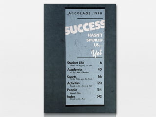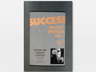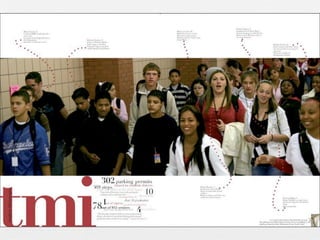 The document provides guidance on developing themes for yearbooks. It discusses that the theme unifies the book and gives it purpose and structure. It recommends brainstorming potential themes by considering facts about the school, key words, catchphrases, locations, mascots/colors, and significant events. Visual representations of themes in logos and graphics are important. An effective theme should apply to the entire school community, cover the year's events, and appeal to students. Developing a theme packet with mock-ups of cover, endsheets, and other elements can solidify the theme.