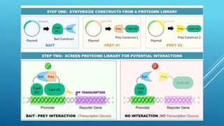 The document discusses yeast hybrid systems, specifically yeast one-hybrid (Y1H), yeast two-hybrid (Y2H), and yeast three-hybrid (Y3H) assays used to study protein-DNA and RNA-protein interactions. Y1H and Y2H differ in that Y1H measures protein-DNA interactions while Y2H measures protein-protein interactions, with Y3H allowing for RNA-protein interaction analysis. The advantages and disadvantages of each system are outlined, highlighting key factors such as sensitivity, specificity, and potential false positives.