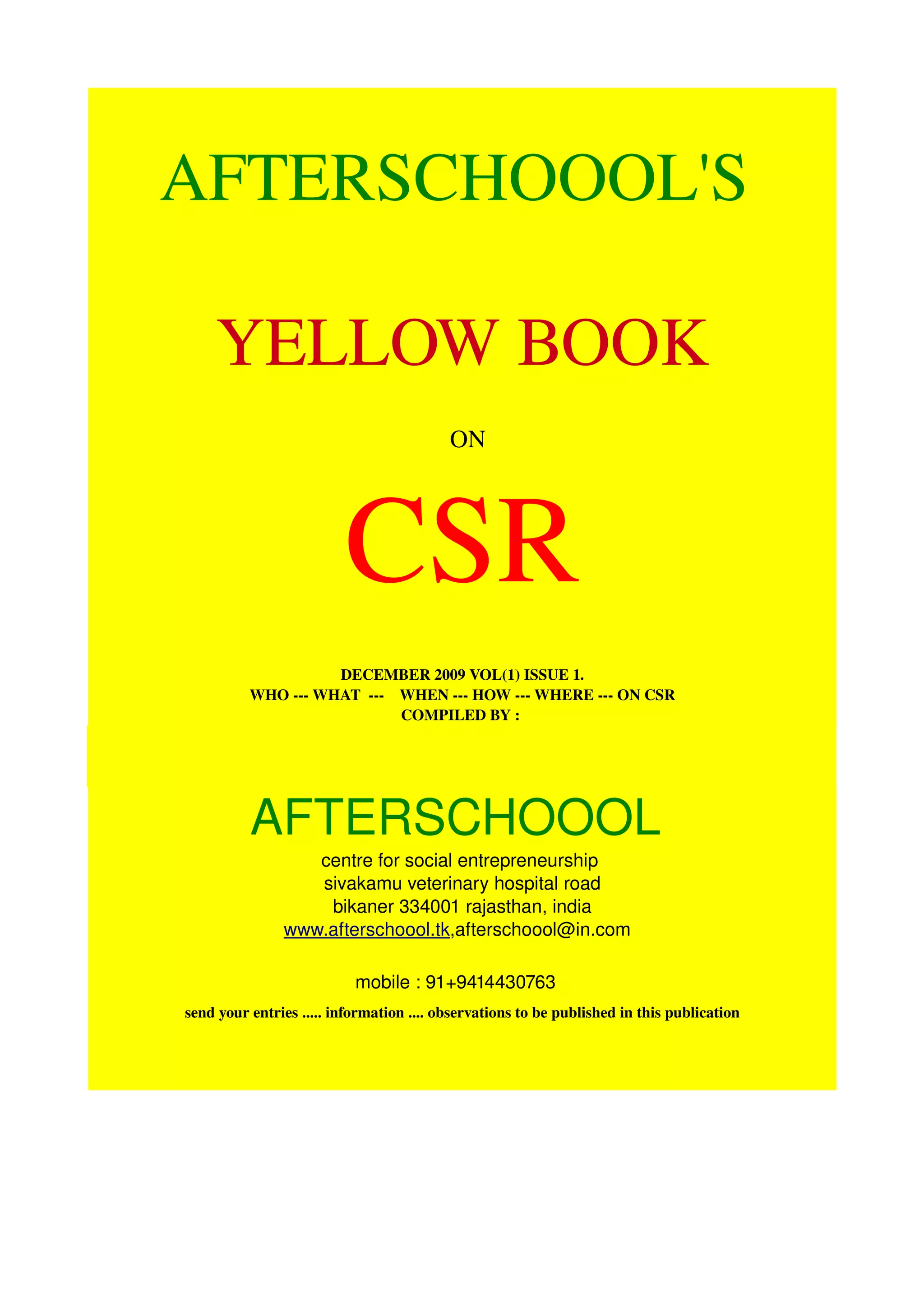 The document is a December 2009 publication by Afterschoool focusing on Corporate Social Responsibility (CSR) initiatives in India, compiled by various social activists and academicians. It highlights significant corporate efforts towards social upliftment, sustainable development, and community engagement, citing examples from companies like Tata Group, Ambuja Cements, and Dr. Reddy's Laboratories. The publication encourages readers to contribute articles and observations on CSR, promoting a collaborative approach to social entrepreneurship and corporate trusteeship.