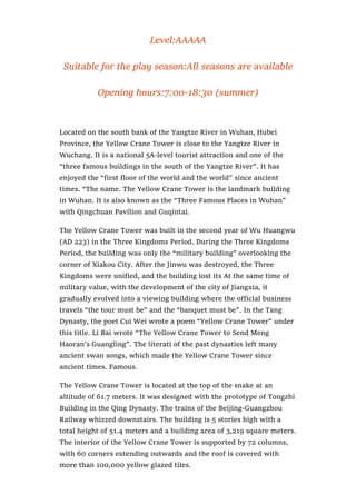 The Yellow Crane Tower is a landmark building located in Wuhan, Hubei Province, China. It is a 5-story national landmark that has been rebuilt multiple times throughout history. Originally constructed in the 3rd century AD, it has since evolved from a military watchtower to a popular tourist destination known for its panoramic views of the Yangtze River and Wuhan cityscape from its high vantage point. The tower derives its name from a legend about a yellow crane that once helped a local business owner and inspired the construction of the tower in its honor. Today, it remains one of Wuhan's most iconic structures.