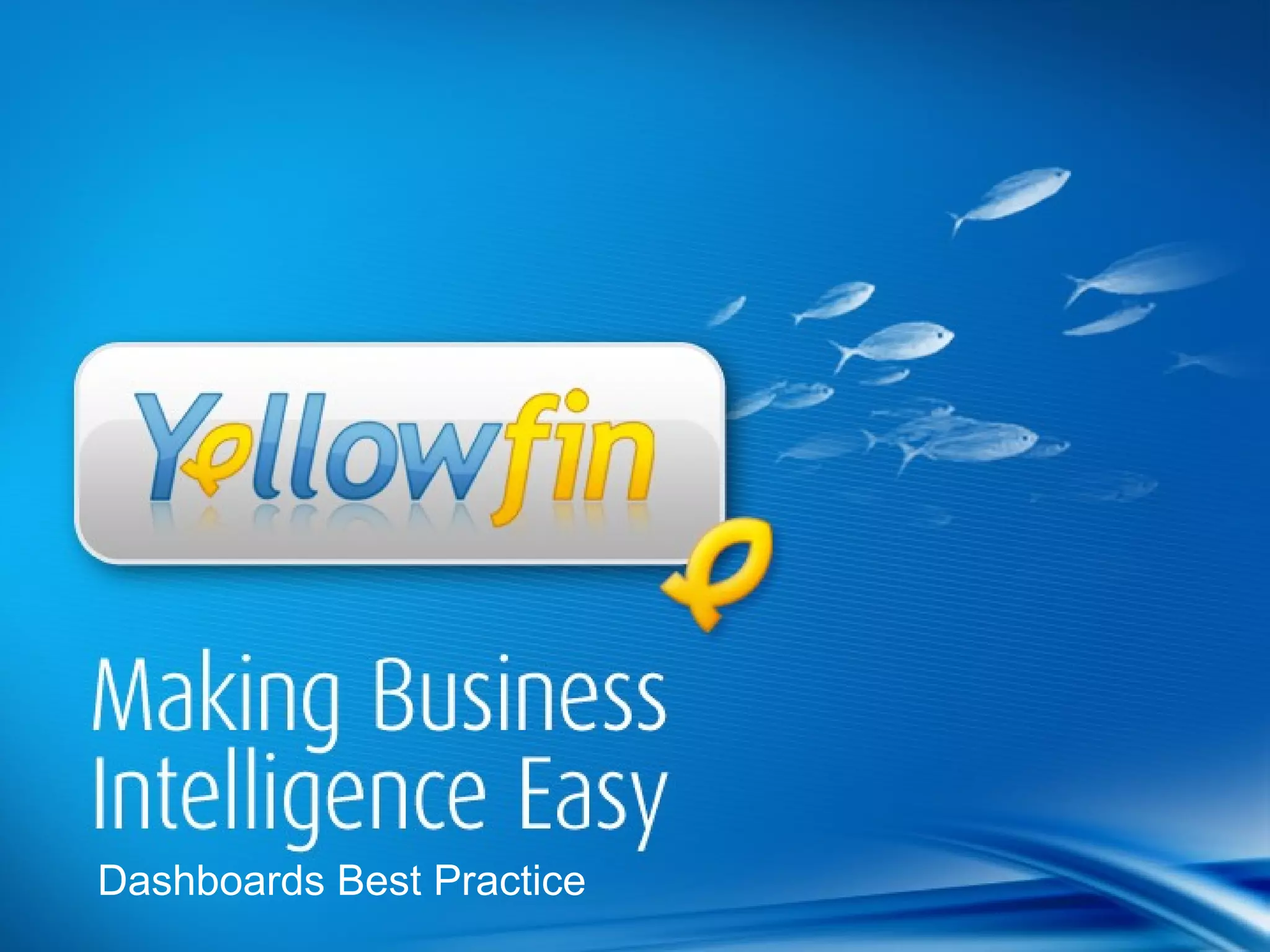 This document discusses best practices for designing dashboards. It outlines 12 best practices: 1) Design dashboards for a specific purpose, 2) Ensure consistent, high-quality data, 3) Make dashboards relevant to intended users, 4) Display important metrics through KPI dashboards, 5) Start with a high-level overview, 6) Make dashboards interactive, 7) Keep dashboards simple, 8) Draw attention to important information using color, 9) Select layouts that assist information flow, 10) Position/size content to reflect relative importance, 11) Prioritize communication over aesthetics, 12) Plan for mobile and device independence.