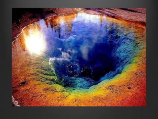 Yellowstone National Park is located primarily in Wyoming and is home to the Yellowstone supervolcano. The supervolcano has erupted massive explosions over 2.1 million years ago and could potentially wipe out 2/3 of the United States if it were to erupt again. Yellowstone is also famous for its geothermal features like geysers, containing the majority of the world's most famous geysers, including Old Faithful. Yellowstone was established as the first national park in the United States in 1872 and sees over 3 million visitors each year who come to experience the natural beauty and geology of the park.