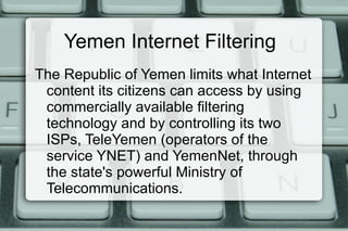 The Republic of Yemen limits its citizens' internet access through two state-controlled ISPs using commercial filtering technology. It demonstrates particular sensitivity around security issues, criticism of the government, and relations with Saudi Arabia. While internet access is not formally restricted, costs are prohibitively high for many Yemenis. TeleYemen, the largest ISP, bans content deemed obscene, offensive, inconsistent with Islam, defamatory, or threatening to security or national unity. OpenNet Initiative testing found pornography was the primary target of filtering by both ISPs, with other content types filtered to varying degrees.
