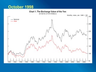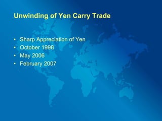 This document discusses the yen carry trade, which involves borrowing low-interest Japanese yen to invest in higher yielding currencies. It provides background on Japan's post-war economic growth and details how structural weaknesses in Japanese banks and its central bank's easy monetary policy contributed to the yen carry trade. The document outlines the mechanics of carry trades and analyzes periods of unwinding in 1998, 2006, and 2007 that were sparked by events like the LTCM crisis and subprime mortgage fears, causing sharp yen appreciation and global market volatility.