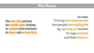 Yengage is a one-stop partner for mobile app companies looking to expand their business in Japan and Asia. They provide a full suite of app marketing services including strategy, analytics, production, media management, and operations. Their expertise in the Japanese and Asian markets allows them to develop effective marketing campaigns through proprietary ad technology, extensive industry relationships, and experienced local knowledge.