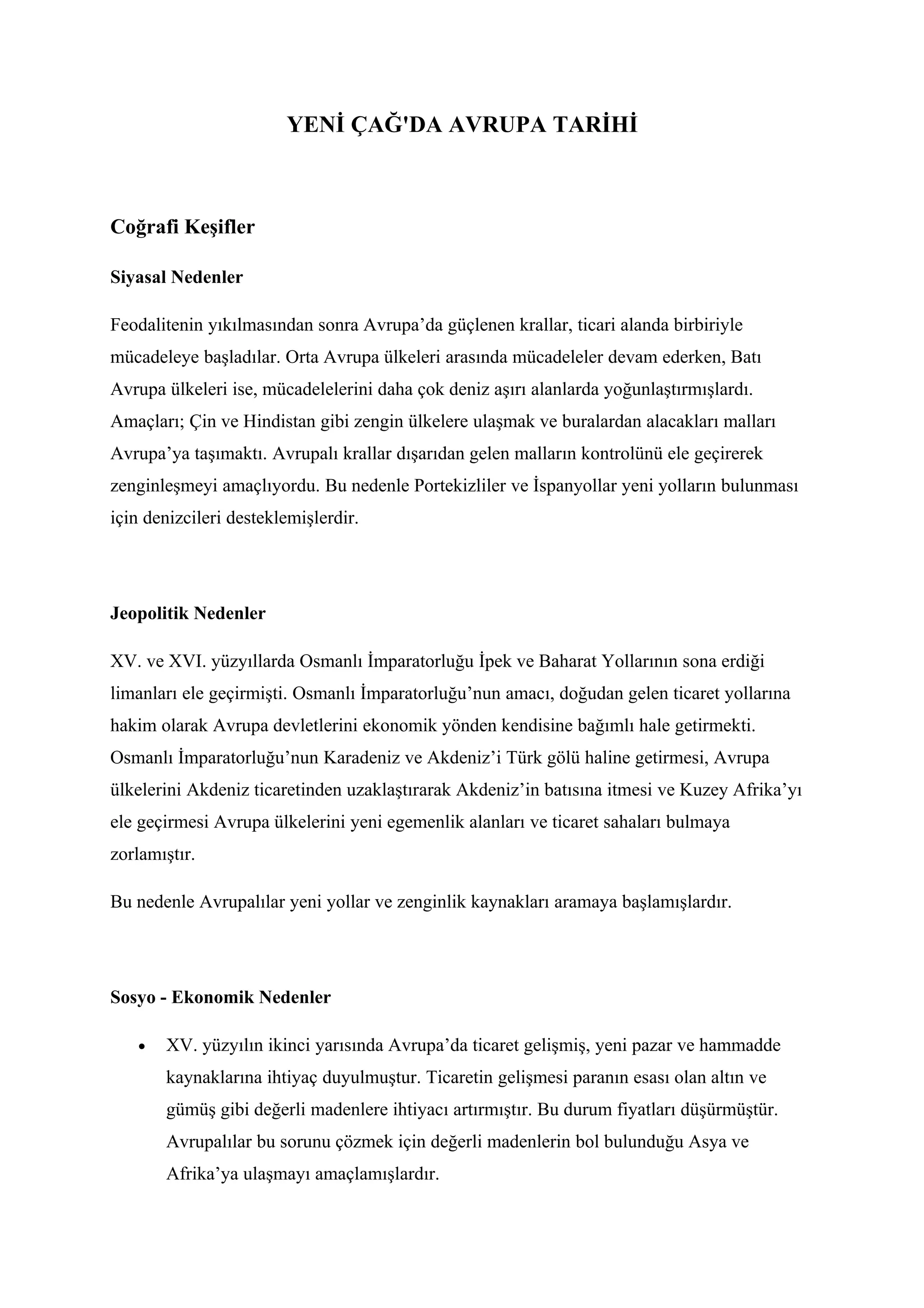 Bu nedenle Avrupalılar yeni yollar ve zenginlik kaynakları aramaya başlamışlardır.