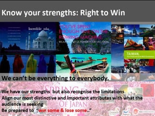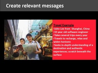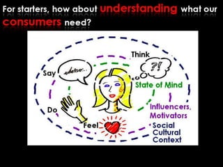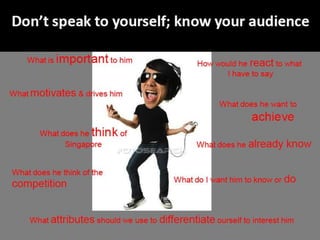 The document discusses using insights from brain science and Emergenetics to improve branding and communication strategies. It highlights attributes of 21st century learning like knowledge application, independent learning, communication, and co-creation. The document suggests understanding audience perceptions and positioning brand value to resonate with them. Examples of the Singapore Tourism Board and Project Happy Feet nonprofit are provided. The focus is on applying analytical, conceptual, structural and social thinking preferences to develop effective marketing approaches.