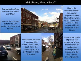 The document summarizes the author's observations from visiting five stores in downtown Montpelier, Vermont on Main Street: an art store, book store, stationary store, clothing store, and drug store. The author notes several themes including that most buildings date to the 19th century, signage choices, themes in store windows, what products are featured prominently, and opportunities for improving storage and display strategies in the small stores with limited space.