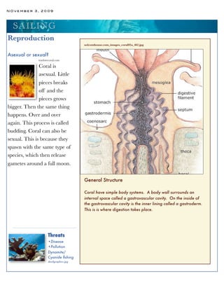 Coral cannot move on its own, but the cells inside coral can move around. Coral gets nutrition both by eating small animals using stinging cells on its tentacles and through photosynthetic algae called zooxanthellae that live inside coral tissues and provide up to 90% of coral's energy. Coral can reproduce both asexually through budding where pieces break off and grow into new coral, and sexually when coral spawn gametes around a full moon. Threats to coral include disease, pollution, cyanide and dynamite fishing.