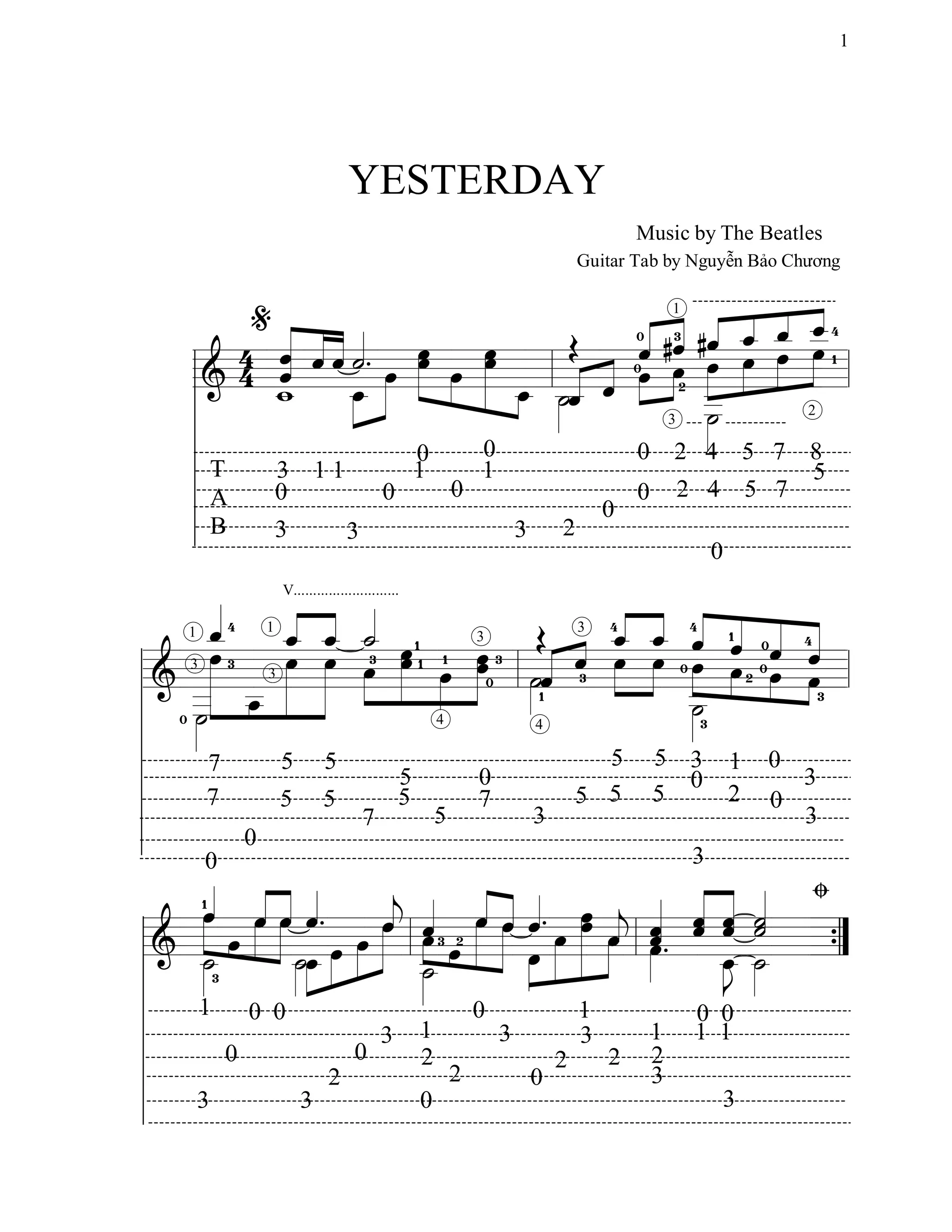 The document contains guitar tab for a song, including notes represented by symbols on six lines to indicate the fret positions and strings to play on a guitar. It includes the music notation broken into measures with time signatures. The tab is credited to Nguyễn Bảo Chương and the music to The Beatles.