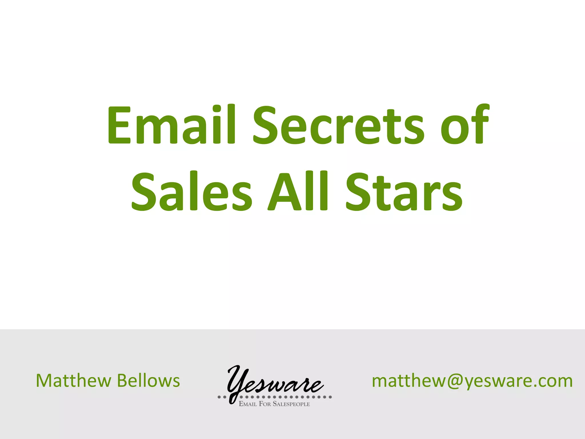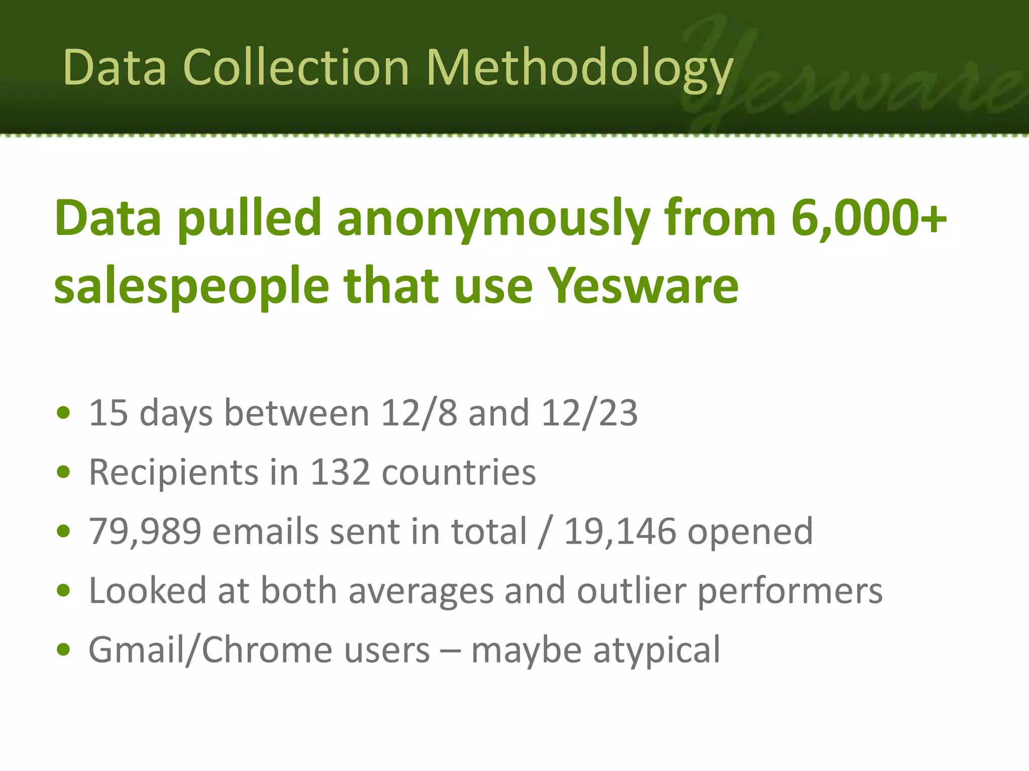 The document presents insights on sales email effectiveness based on data from over 6,000 salespeople using Yesware. Key findings include strategies such as sending emails to multiple recipients, optimal timing for sending emails, and utilizing shorter subject lines for increased open rates. Additionally, it highlights the importance of tracking open rates for performance benchmarking and provides tips for maximizing email engagement.