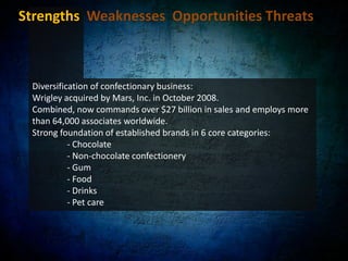 Wrigley has dominated the global gum market for over 100 years but faces new challenges adapting to changing consumer preferences and increasing competition. To strengthen its position, Wrigley is exploring social media marketing, focusing on health benefits to appeal to developing markets like China, and diversifying its product portfolio through the Mars acquisition. Wrigley's strengths include strong brands and R&D but it relies heavily on the US market and faces threats from low-cost competitors. Adapting to marketing trends and leveraging partnerships will be important to sustain growth in China's expanding confectionery industry.