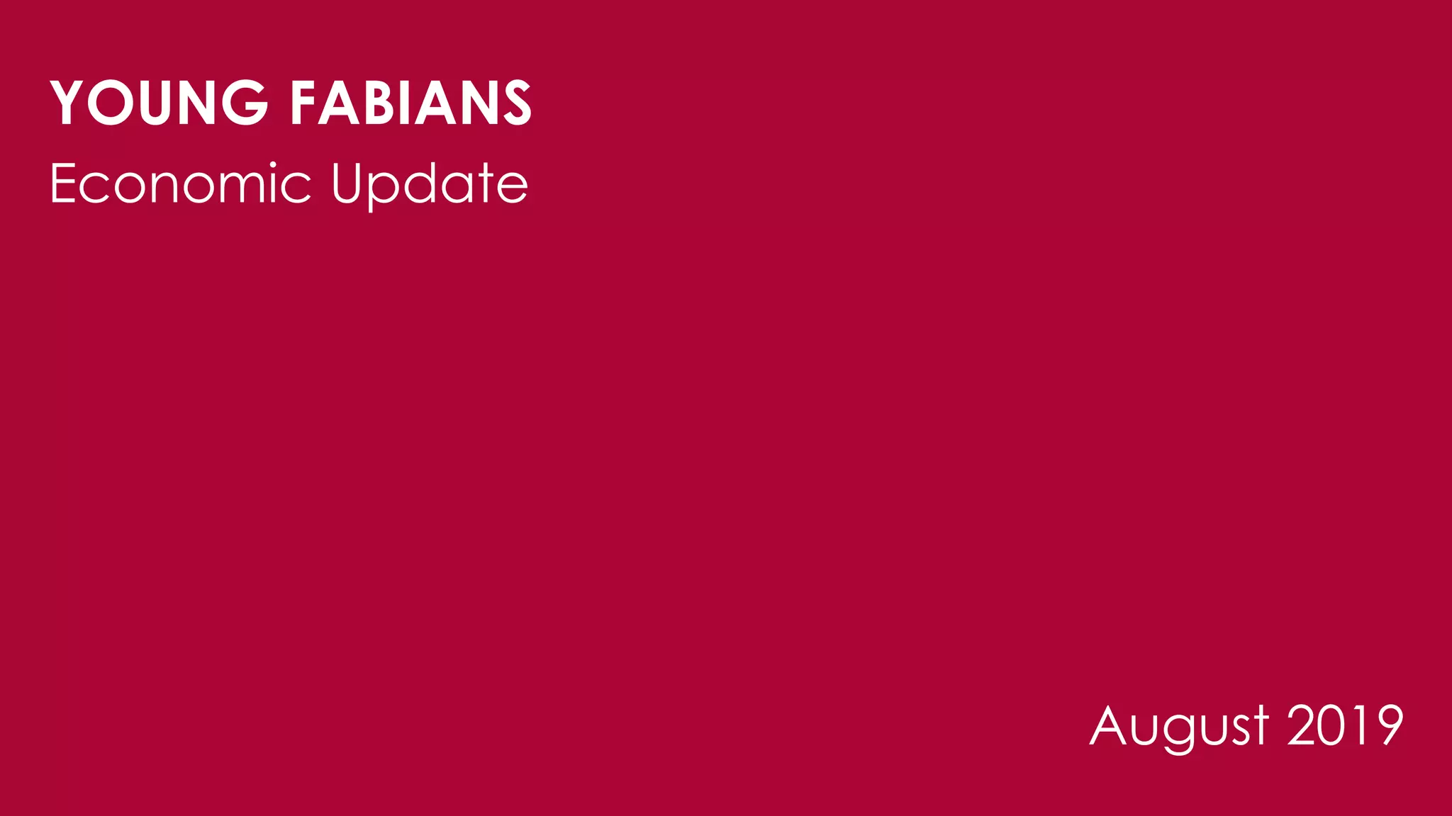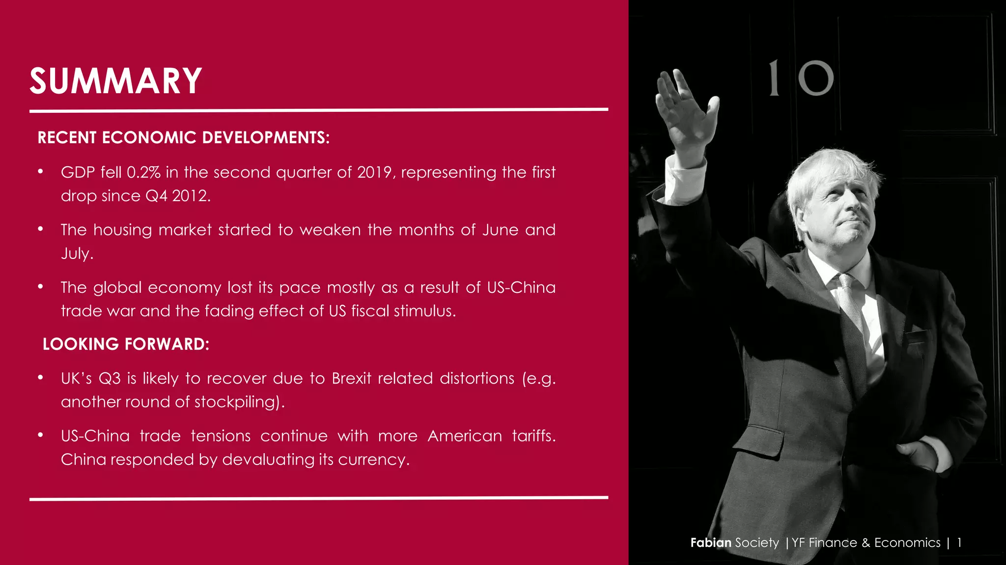 The document provides an economic update from the Young Fabians in August 2019. It summarizes recent UK economic developments, including GDP contracting in Q2 2019 for the first time since 2012, a weakening housing market, and slowing global growth due to trade wars. It then looks forward, noting potential GDP recovery in Q3 but continued trade tensions. Charts show declining business and consumer confidence, falling stock markets, and downgraded GDP and higher unemployment forecasts by the IMF and YFEF compared to other institutions.