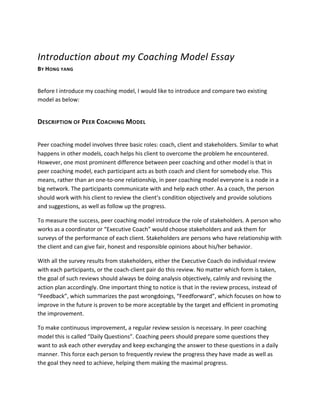 The document introduces two existing coaching models: the peer coaching model and cognitive coaching model. The peer coaching model involves coaches, clients, and stakeholders providing feedback in a network. The cognitive coaching model focuses on a coach developing a client's problem-solving skills through questioning rather than providing direct answers. Both models emphasize regular client reviews and goal-setting to promote continuous self-improvement.