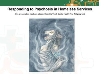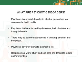 The document discusses psychotic disorders and provides guidance on responding to someone experiencing psychosis. It defines psychosis and lists common symptoms involving changes in emotion, thinking, perception and behavior. Early intervention is important to reduce negative long-term impacts. The main steps outlined are to assess safety risks, listen without judgment, provide reassurance and encourage seeking professional help. Self-help strategies and local support services are also recommended.