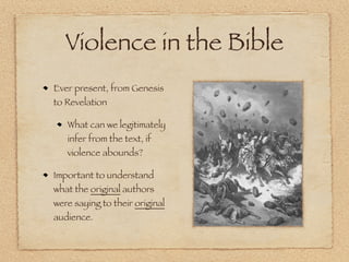 The document discusses how violence is portrayed in the biblical creation and early family narratives of Genesis. It suggests that these stories were likely influenced by Babylonian myths the Israelites were exposed to during their exile in Babylon. However, the biblical stories present a contrasting portrayal of creation, God, and humanity's relationship to God as more peaceful. It analyzes the Cain and Abel story as establishing violence but providing a model of nonviolence through Seth's genealogy rather than Cain's violent one. The conclusion suggests the original authors did not view violence favorably or ambiguously based on this context and interpretation.