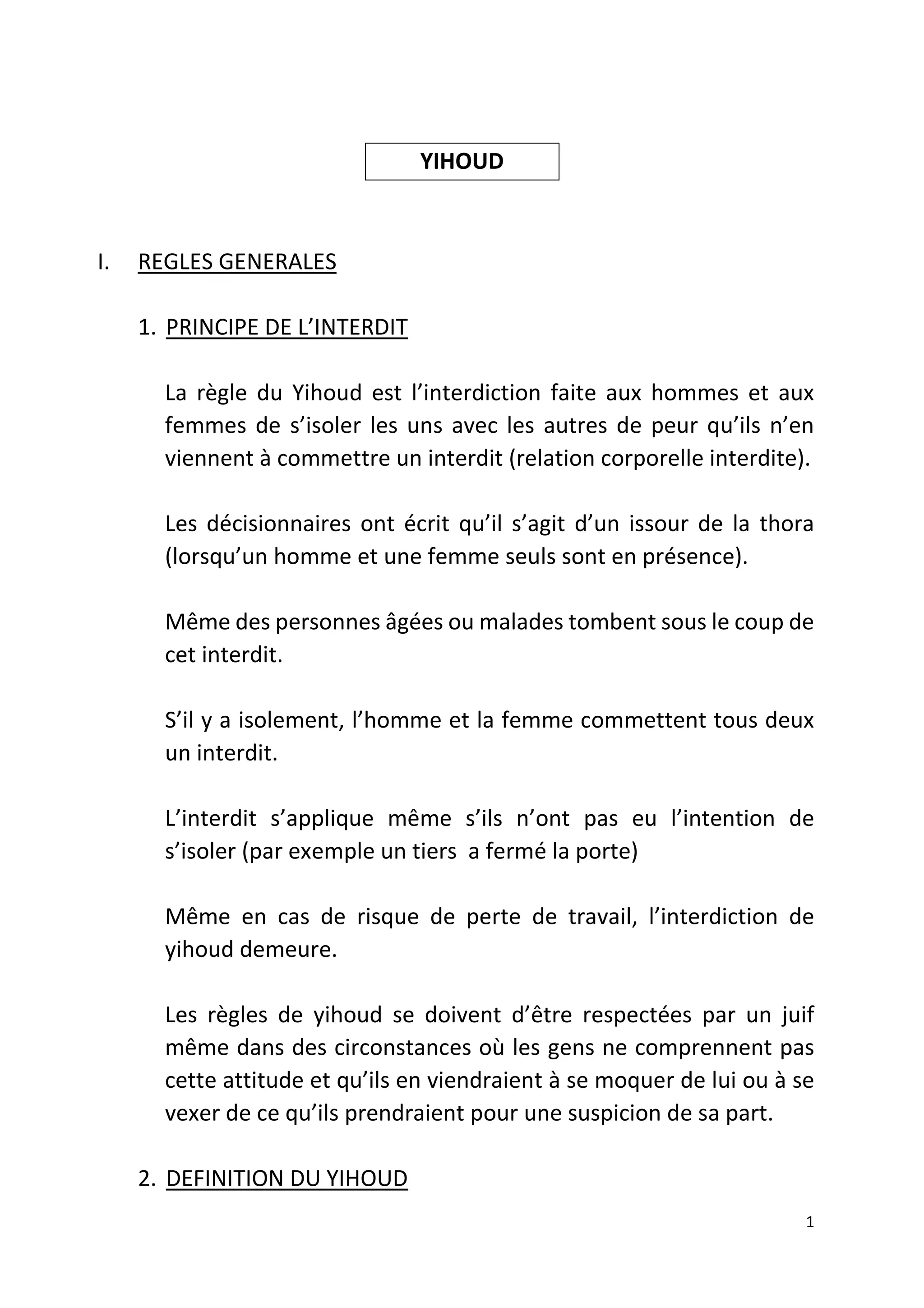 Le document traite des règles relatives au yihoud, interdisant l'isolement d'un homme et d'une femme dans des lieux privés pour prévenir des comportements indésirables. Ces règles s'appliquent quel que soit l'âge ou la situation des individus concernés, incluant des précautions pour les rencontres dans des contextes divers. Des exceptions sont mentionnées, notamment en présence de membres de la famille proches ou de chaperons, mais des restrictions strictes subsistent pour maintenir cette interdiction dans les situations où cela pourrait mener à un abus de la loi.