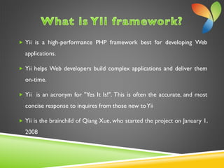 This document compares the Yii web application framework to CodeIgniter. It states that Yii is a more fully-featured framework for developing complex web applications, while CodeIgniter is better suited for simpler projects. Some key advantages of Yii mentioned include its code generation abilities, form handling, integration of jQuery, support for internationalization, and handling of database relations through features like lazy loading. Overall, the document argues that Yii's more complete set of features make it a better choice than CodeIgniter for most web development projects.