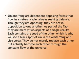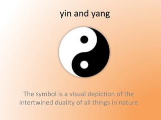 The symbol of yin and yang depicts the intertwined duality of opposing yet complementary forces that are found in nature. Yin and yang are dependent on each other and represent darkness and light, female and male, passive and active qualities. They seek balance as part of the Tao and contain aspects of each other, with a dot of one element existing in the other. Examples of yin and yang in art, nature, and the human body are given.
