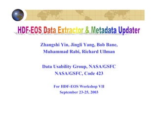 HEEX and HEMU are tools for extracting and updating metadata in HDF-EOS files. HEEX can extract HDF-EOS data and metadata to binary, ASCII, HTML or XML formats. It extracts all data fields or a single specified field. HEMU allows users to extract, replace or update metadata by merging external metadata files with the internal HDF-EOS metadata. It checks metadata syntax and requires three inventory metadata fields to match before updating.
