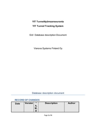 Tài liệu mô tả hệ thống theo dõi đường hầm YIT, bao gồm các phần về định vị, thu thập dữ liệu và báo cáo. Nó cung cấp thông tin chi tiết về các thành phần như tag, RFID và máy móc. Ngoài ra, tài liệu ghi lại lịch sử thay đổi phiên bản từ ngày 24/06/2013.