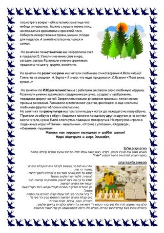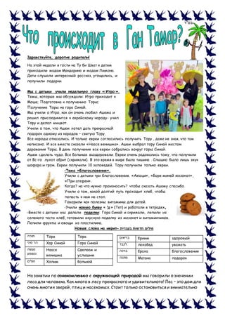 На этой неделе дети праздновали Ту Би Шват, слушали рассказы, получали подарки и изучали недельную главу «Итро», включая подготовку к получению Торы на горе Синай. Также учащиеся изучали благословения, новую букву и принялись за поделки, включая формирование хлеба и фруктов из теста и пластилина. В занятия входили математика, развитие речи, рисование и физкультура, а также разговоры о значении леса.