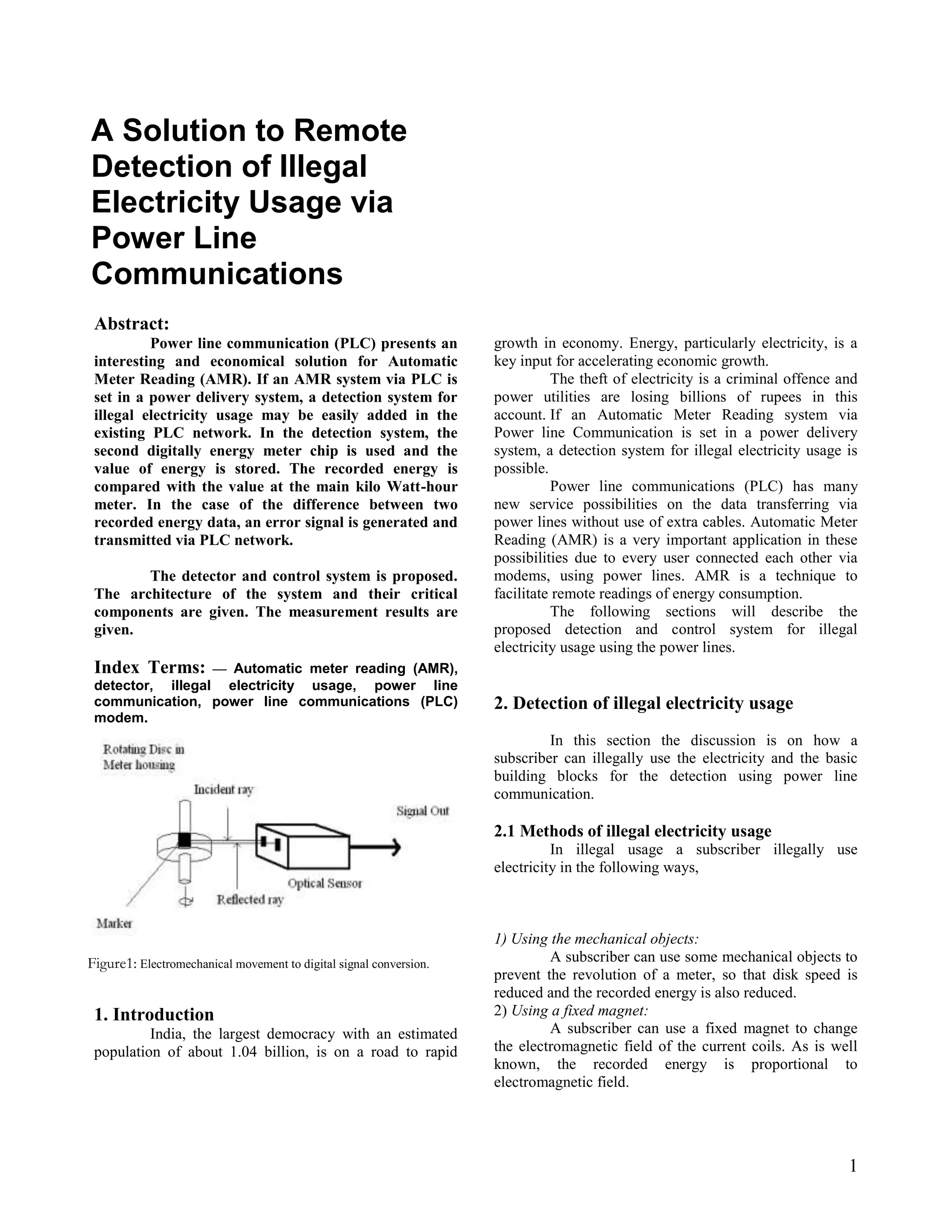 The document proposes a system to detect illegal electricity usage via power line communications (PLC). The system would add a secondary digital energy meter and PLC modem at the connection point between a subscriber's line and the main power lines. The recorded energy from this secondary meter would be compared to the value from the subscriber's primary meter. If a difference is detected, an error signal would be generated and transmitted over the PLC network, allowing detection of illegal usage. The proposed system architecture and components are described. Measurement results indicate the system could economically help reduce electricity theft.