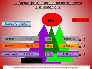 Документ содержит маркетинговый план с детализированными уровнями вознаграждений для участников с различными статусами, такими как серебро, золото и бриллиант. Указывается, что участники могут получать доходы в зависимости от товарооборота и структуры своих веток, а также предоставляются схемы расчета доходов от автопокупок и розницы. В плане также предусмотрены лидерские звания и бонусы за руководство, а также награды за достижения и активность.