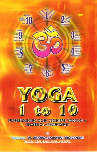 The document discusses 'Yoga: 1 to 10' by Dr. Ananda Balayogi Bhavanani, highlighting its unique exploration of numbers as fundamental to the principles of yoga and spiritual understanding. It emphasizes how numbers serve not only as measurements but also as reflections of cosmic patterns, influencing both spiritual practices and daily life. The book is presented as a comprehensive and enlightening resource for practitioners and teachers of yoga, blending ancient wisdom with modern perspectives.